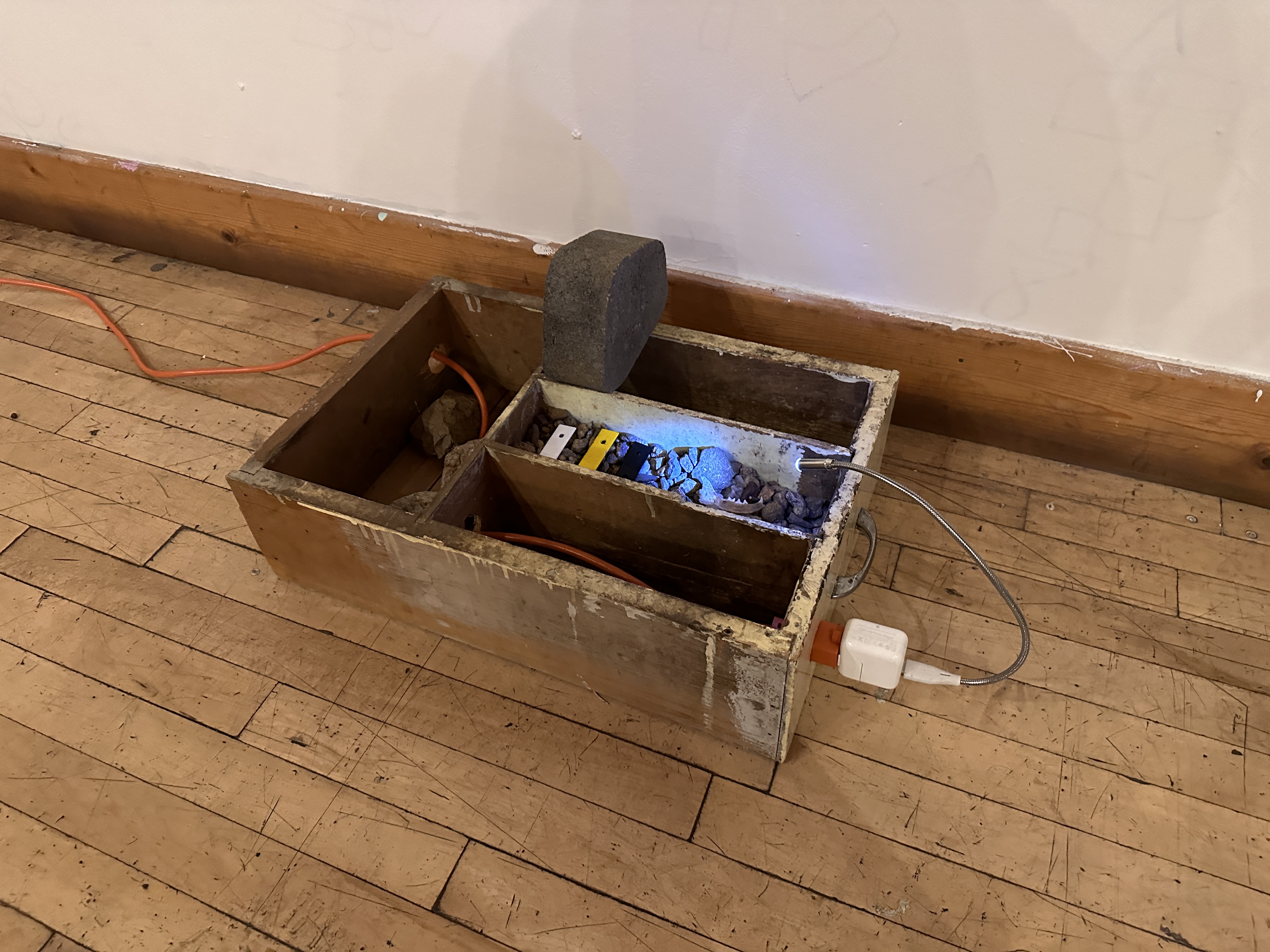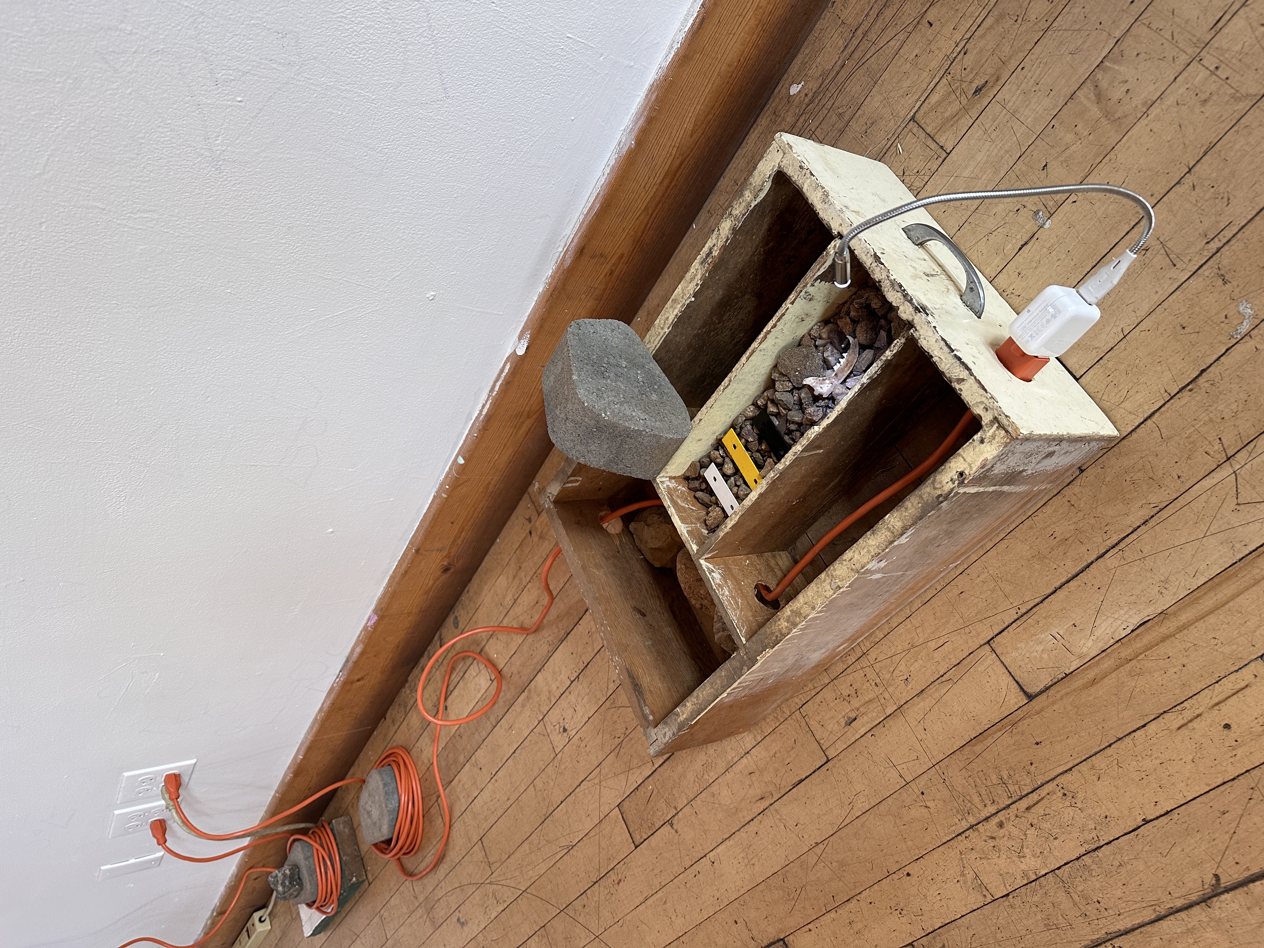 DECOMPOSER is an installation and multichannel composition for several assemblages. A constellation of humor, garbage, didactics, cut grass, paint chips, and new media. A scraping for nutrients through manipulating decaying materials; composing a domestic quandary while things are seemingly rotting. A toast to drinking in sour fecundity and stubborn joy when dwelling with this late-stage tremulation.