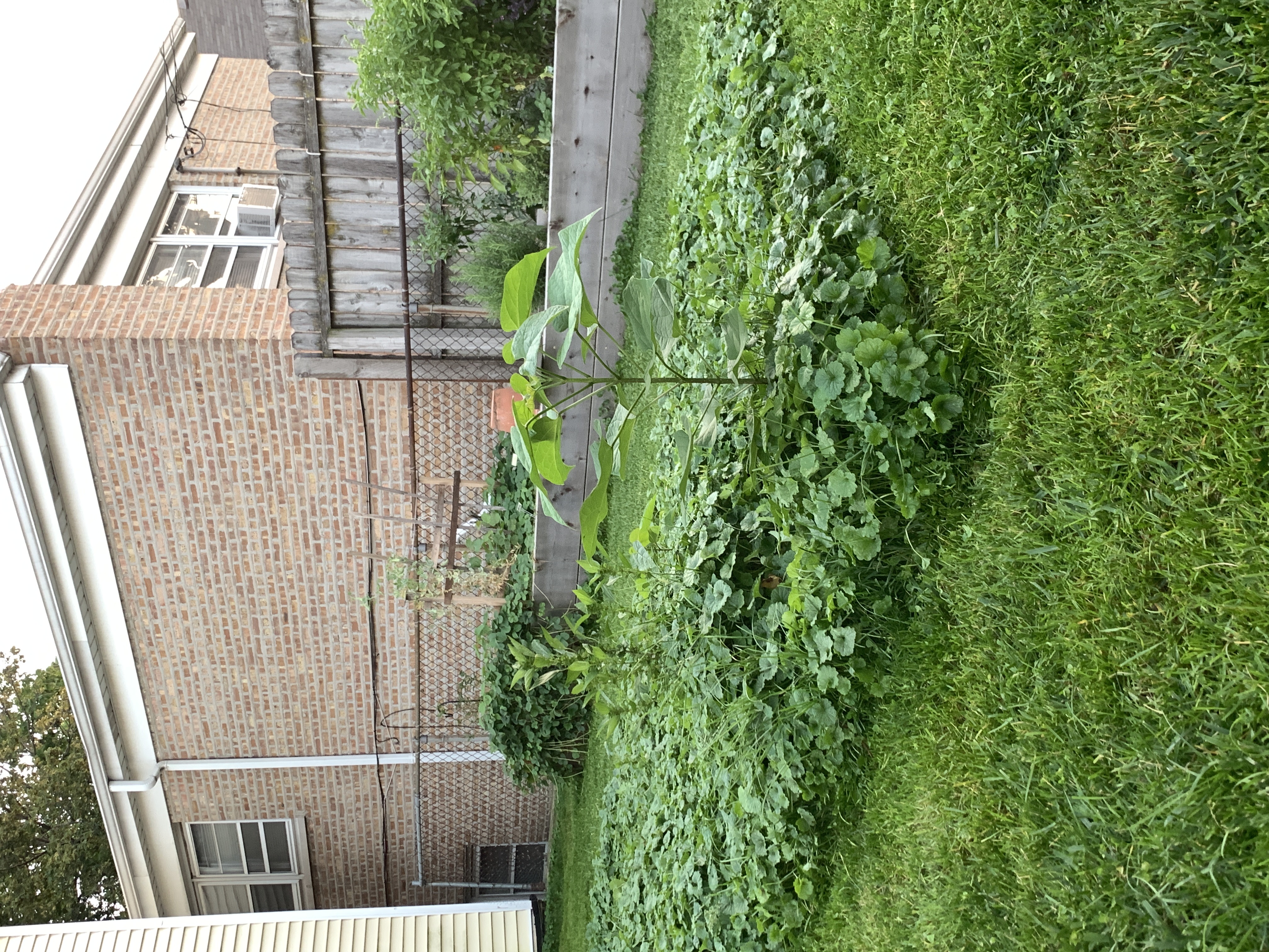 The central strip of my relatively groomed backyard was left unmowed for an entire season. Invasive species, namely creeping charley (Glechoma hederacea) overran the strip. Eventually a catalpa tree (Catalpa speciosa) sprouted and took root.